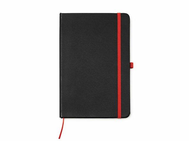 Блокнот формата А5 в твердой обложке из черного полиуретана. Цветная закладка, резинка и держатель для ручки. 80 листов в линейку.