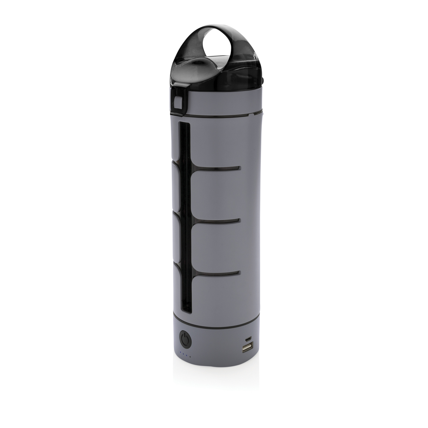 Уникальная бутылка со встроенным аккумулятором Swiss Peak изготовлена из износостойкого и экологичного материала Tritan. Объем – 560 мл. Нижняя часть представляет собой аккумулятор на 5000 мАч, которым можно зарядить свое мобильное устройство. Переверните бутылку, и она превратится в удобную подставку для телефона. Входное и выходное напряжение 5 В/1 А. Поставляется с кабелем micro-USB.