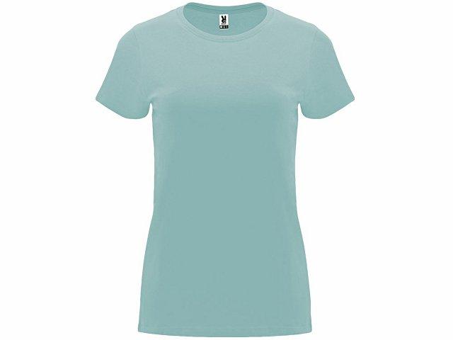 Женская приталенная футболка. Круглый вырез горловины обработан рибом 1х1. Шов горловины укреплен тесьмой.