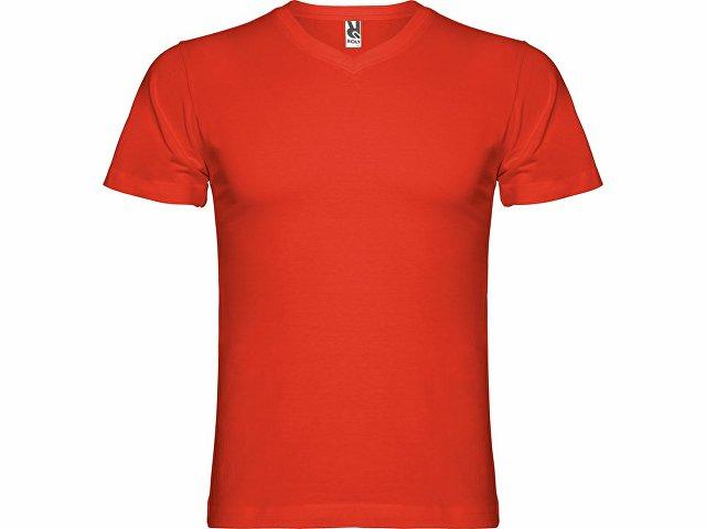 Мужская футболка без боковых швов с коротким рукавом и V-образным вырезом горловины, отделанном рибом 1х1. Горловина и плечевые швы дополнительно укреплены тесьмой.
