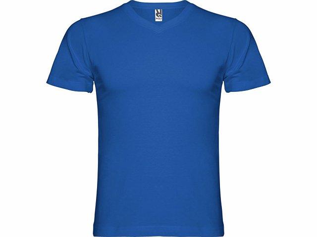Мужская футболка без боковых швов с коротким рукавом и V-образным вырезом горловины, отделанном рибом 1х1. Горловина и плечевые швы дополнительно укреплены тесьмой.