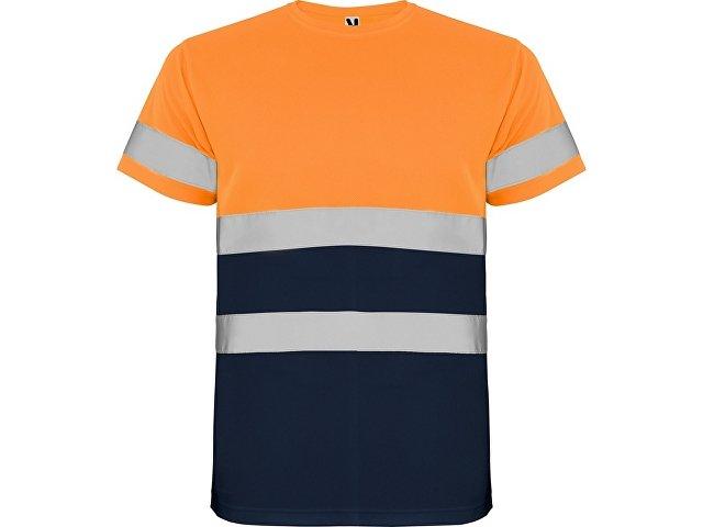Футболка со светоотражающими элементами с короткими рукавами. Круглая горловина из той же ткани, с усиленными закрытыми швами на внутренней стороне горловины. Две горизонтальные светоотражающие полосы на туловище и одна светоотражающая полоса на рукавах.
