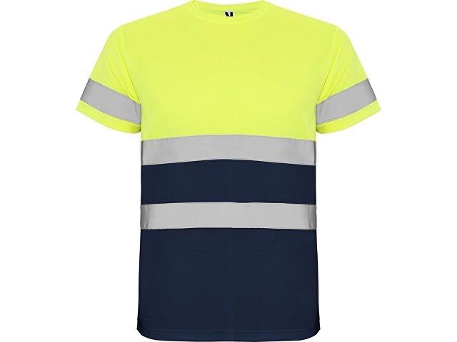 Футболка со светоотражающими элементами с короткими рукавами. Круглая горловина из той же ткани, с усиленными закрытыми швами на внутренней стороне горловины. Две горизонтальные светоотражающие полосы на туловище и одна светоотражающая полоса на рукавах.