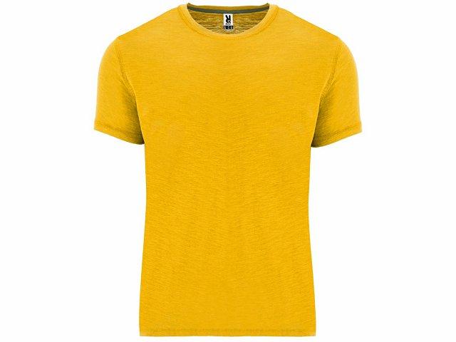 Мужская футболка с коротким рукавом из джерси с протяжками. Горловина отделана тем же полотном и отстрочена плоским швом, дополнительно укреплена тесьмой контрастного цвета. Боковые швы с отстрочкой плоским швом, с разрезом по низу, спинка немного длиннее полочки