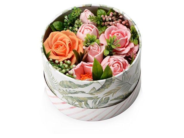 Впечатляющая и изысканная композиция из мыла ручной работы в подарочной коробке. В основе – яркие и реалистичные цветы с нежным ароматом. В композиции также использован флористический декор.