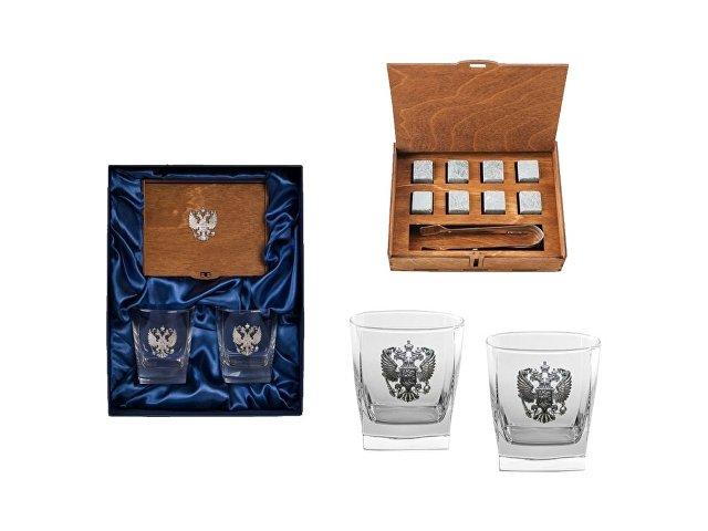 Виски сет с камнями для охлаждения «РОССИЯ» декорированный оловянными барельефами «Герб РФ». Материал барельефов сплав на основе 95% олова(пьютер). В набор входит 2 стакана для виски емкостью 300 мл и деревянная коробочка с камнями для виски и щипцами.