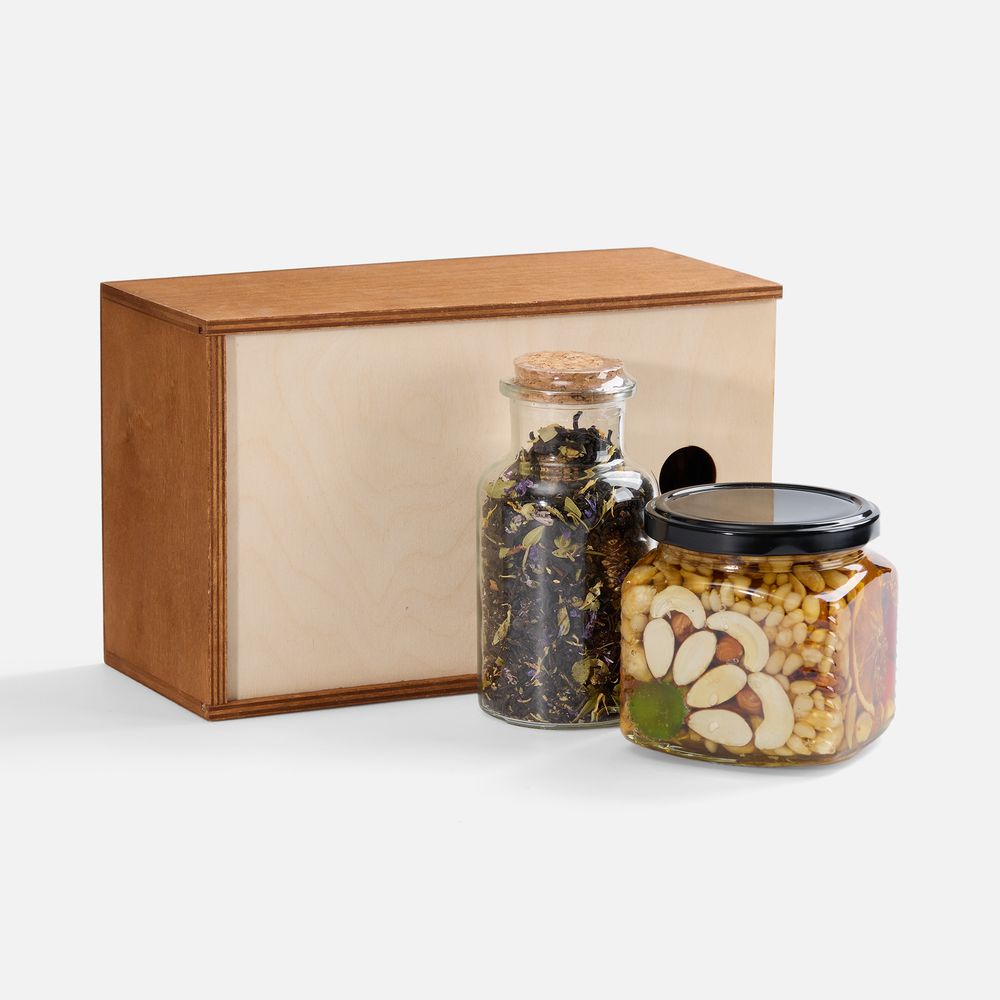 Все упаковано в аккуратный деревянный ящик: такой набор станет практичным подарком или приятным дополнением к вечернему чаепитию для тех, кто любит наслаждаться натуральными вкусами в уютной атмосфере.