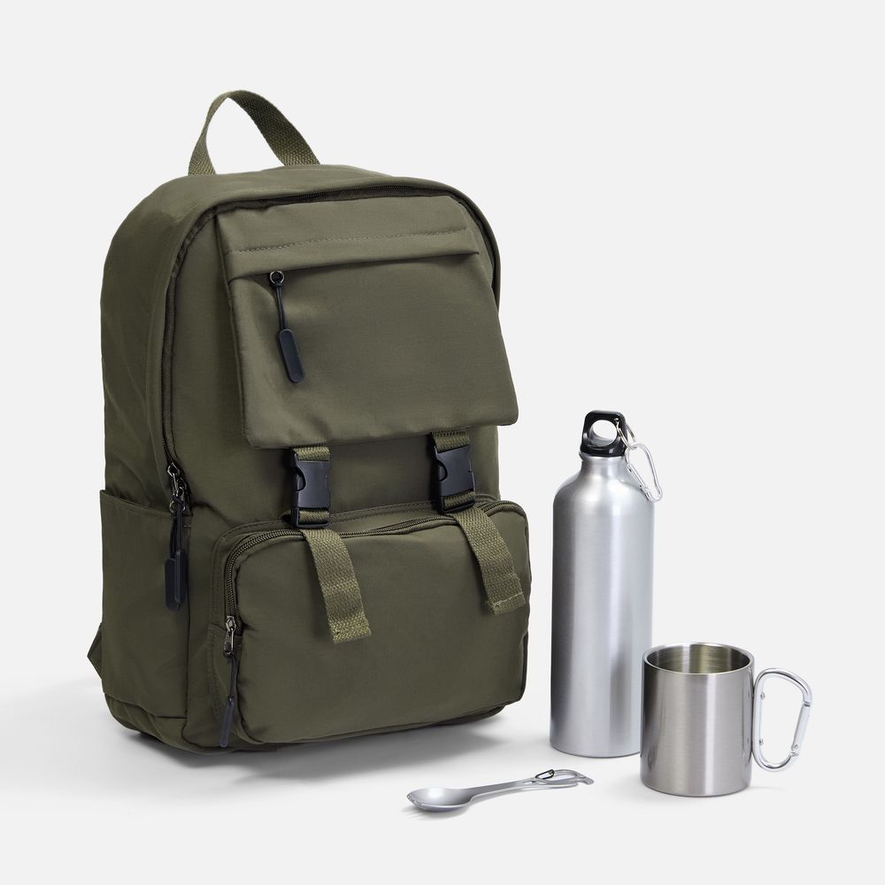 Материалы : рюкзак – нейлон; кружка – пищевая сталь, 304, внутри – нержавеющая сталь, 201; бутылка – алюминий; столовый прибор – нержавеющая сталь, 420