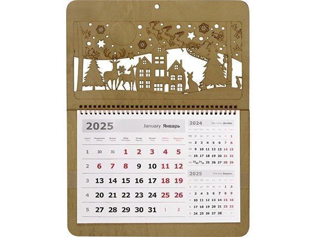 Настенный перекидной календарь имеет необычную «обложку», в роли которой выступают фанерные крышки. Нижняя крышка сплошная, верхняя — резная, ажурная, с вырезанным новогодним пейзажем и большим полем под нанесение логотипа или надписи, которая органично впишется в облик календаря.