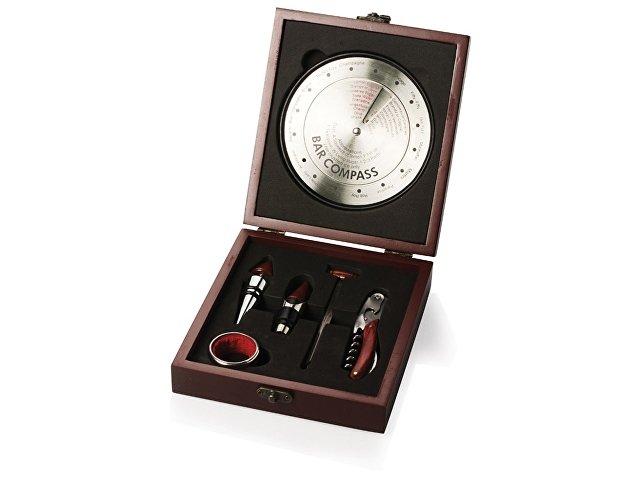 Подарочный набор придется по вкусу любому гурману. В комплект входят штопор-открывалка, пробка для бутылки, устройство для аккуратного розлива вина, термометр, воротничок на бутылку. Набор упакован в деревянный подарочный футляр, на верхней крышке футляра с внутренней стороны смонтирован оригинальный бар-компас с рецептами.