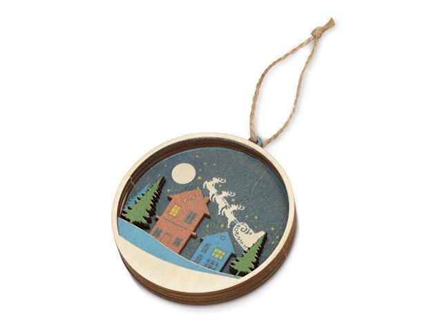 Новогодняя игрушка выполнена из трех слоев фанеры, домики, небо и елочки, изображенные на ней, расположены на разных уровнях, что позволяет создать выпуклый рельеф. Весь зимний пейзаж выглядит объемно, создавая праздничное настроение.