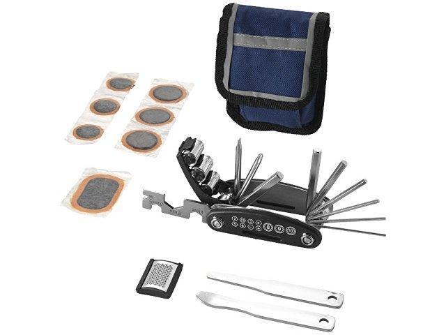 Ремкомплект для велосипеда Wheelie. Многофункциональный инструмент «15 в 1» с 2 инструментами для демонтажа шин, рашпилем, клеем и заплатками, чехлом со светоотражающей каймой и 2 ремешками с застежками на липучке для крепления к велосипеду.