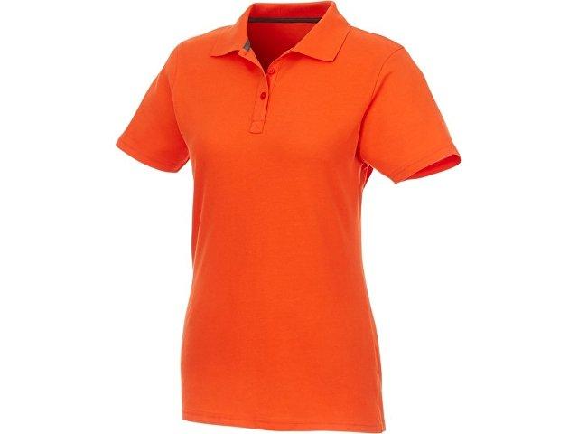 Женское поло Helios с коротким рукавом. Женская модель с разрезами по бокам. Отрезной-отрывной ярлык для комфорта. Воротник гладкой вязкой в рубчик. Планка с тремя пуговицами. Двойная строчка на воротнике и внизу изделия. Пуговицы в цвет изделия. Полоска на горловине в контрастном цвете. Трикотаж Piqué, 100 % хлопок. 180 г/м².