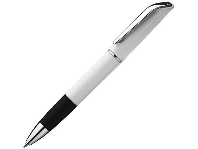 Шариковая ручка с поворотным механизмом и прорезиненной зоной захвата в черном цвете. Металлический клип, декоративное кольцо и металлический наконечник выполнены в серебристом глянцевом цвете.