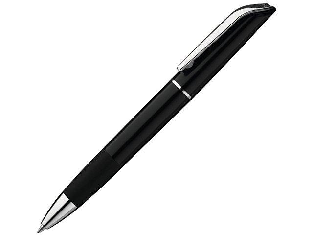 Шариковая ручка с поворотным механизмом и прорезиненной зоной захвата в черном цвете. Металлический клип, декоративное кольцо и металлический наконечник выполнены в серебристом глянцевом цвете.