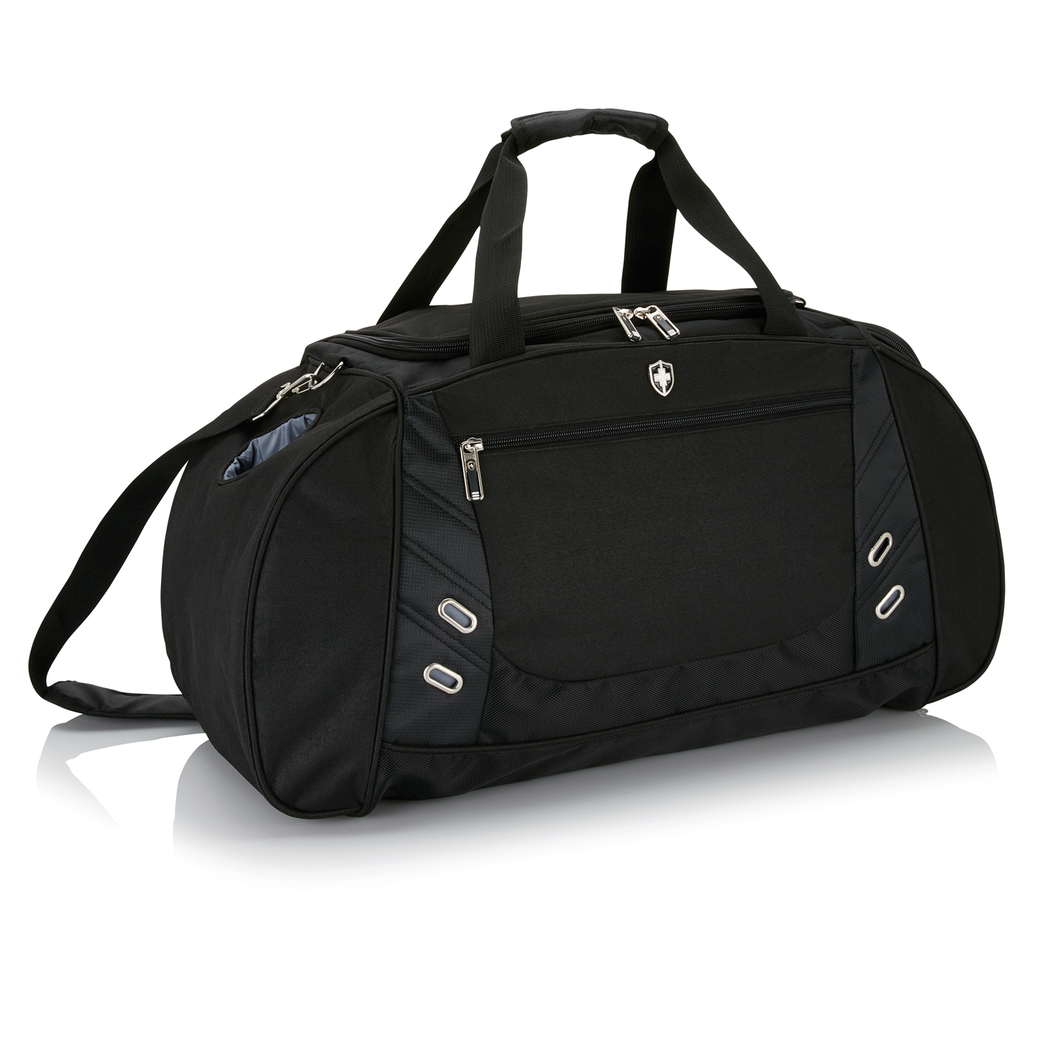 Сумка Swiss Peak из сверхпрочного полиэстера прочностью 600D и 1680D прекрасно подойдет для походов в спортзал или дальней поездки. Вместительное основное отделение закрывается П-образной молнией, есть специальное отделение для обуви с вентиляцией и боковой карман для бутылки. Универсальные удобные двойные ручки и регулируемый наплечный ремень. Не содержит PVC.