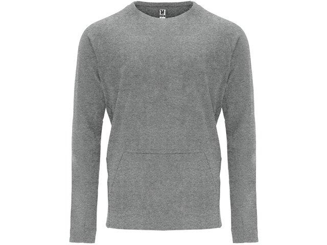 Свитшот с рукавом реглан. Горловина спинки и боковая часть манжет из риба 1х1. Карман кенгуру, диагональные боковые швы с наклонам к центру переда.