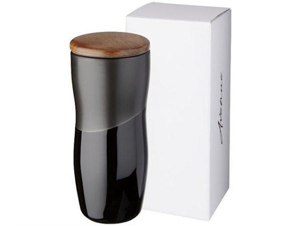 Двустенная керамическая термокружка Reno объемом 370 мл. Двустенная керамическая термокружка с контрастным дизайном из матового и блестящего покрытия. Кроме того, двустенная керамическая конструкция препятствует образованию конденсата на внешней стороне стакана. Оснащена деревянной нажимной крышкой.