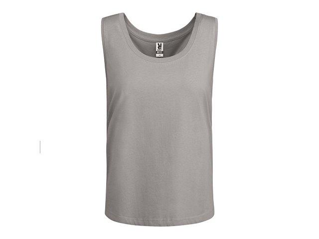Свободная женская футболка с широкими бретелями. Вырез и проймы обработаны бейкой из риба 1×1. Подол округлой формы. Боковые швы.