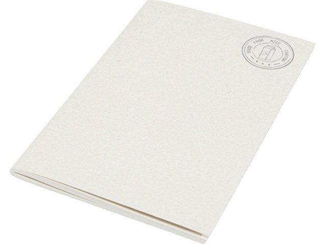 Записная книжка формата А5 с 30 линованными листами плотностью 80 г/м² из переработанных коробок из-под молока (до 70%). Картонные коробки из-под молока собираются, сортируются, перерабатываются и превращаются в бумагу, таким образом действительно превращая мусор во что-то полезное.