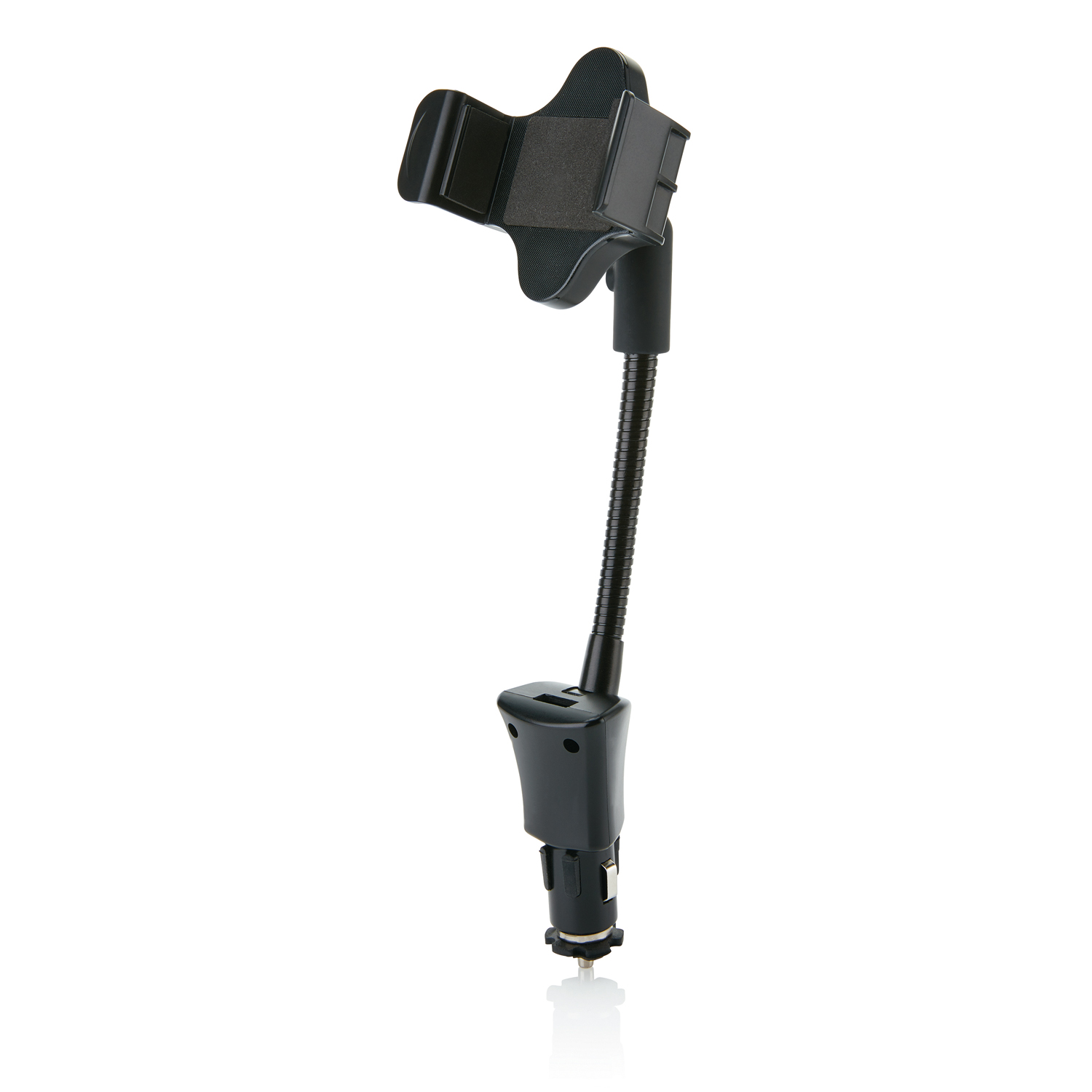 Зарядное устройство для автомобиля с USB-портом и универсальным держателем для телефона. Крепление регулируется и подходит для большинства моделей телефонов. Зарядное устройство позволит вам зарядить телефон и безопасно использовать его во время движения.