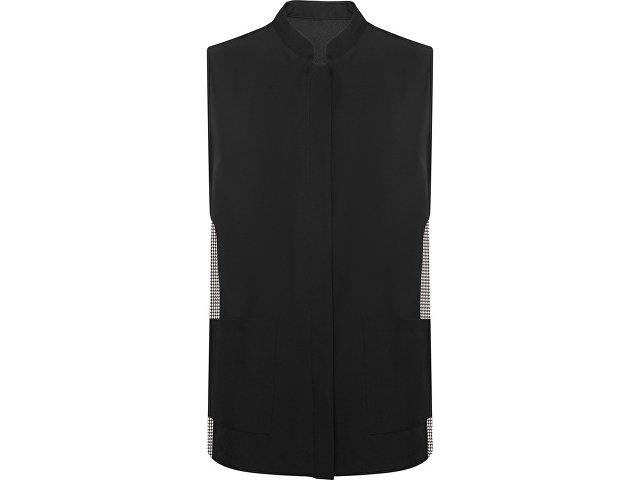 Жилетка без рукавов. Застежка спереди со скрытыми кнопками-застежками. Воротник-стойка, боковые вставки и складки в области груди. Два передних накладных кармана.