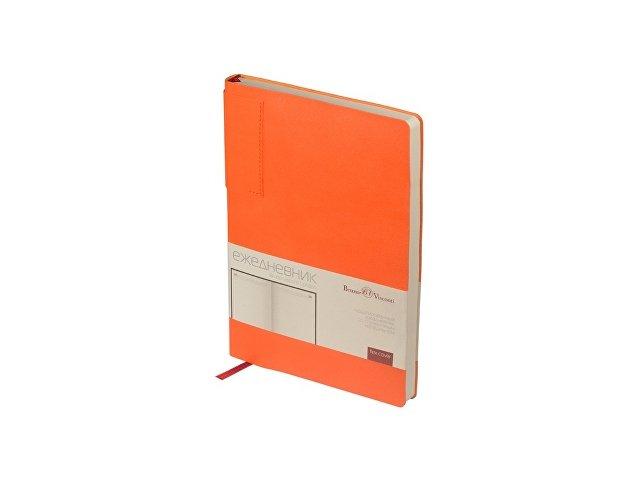 Лаконичная модель в ярком исполнении: гибкая обложка оранжевого цвета с контрастной или в цвет обложки нашивкой. Выполнен из качественной и прочной искусственной кожи, крепление внутреннего блока – книжный переплет, закладка- ляссе. Углы обложки скруглены.
