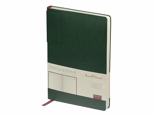 Лаконичная модель в ярком исполнении: гибкая обложка темно-зеленого цвета с контрастной или в цвет обложки нашивкой. Выполнен из качественной и прочной искусственной кожи, крепление внутреннего блока – книжный переплет, закладка- ляссе. Углы обложки скруглены.