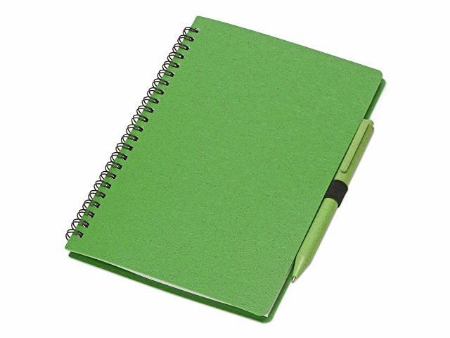 Блокнот с обложкой из переработанной пшеницы и пластика. Блок состоит из 80 листов переработанной бумаги белого цвета. Крепление – пружина. В комплекте шариковая ручка в тон блокноту из пшеничной соломы.