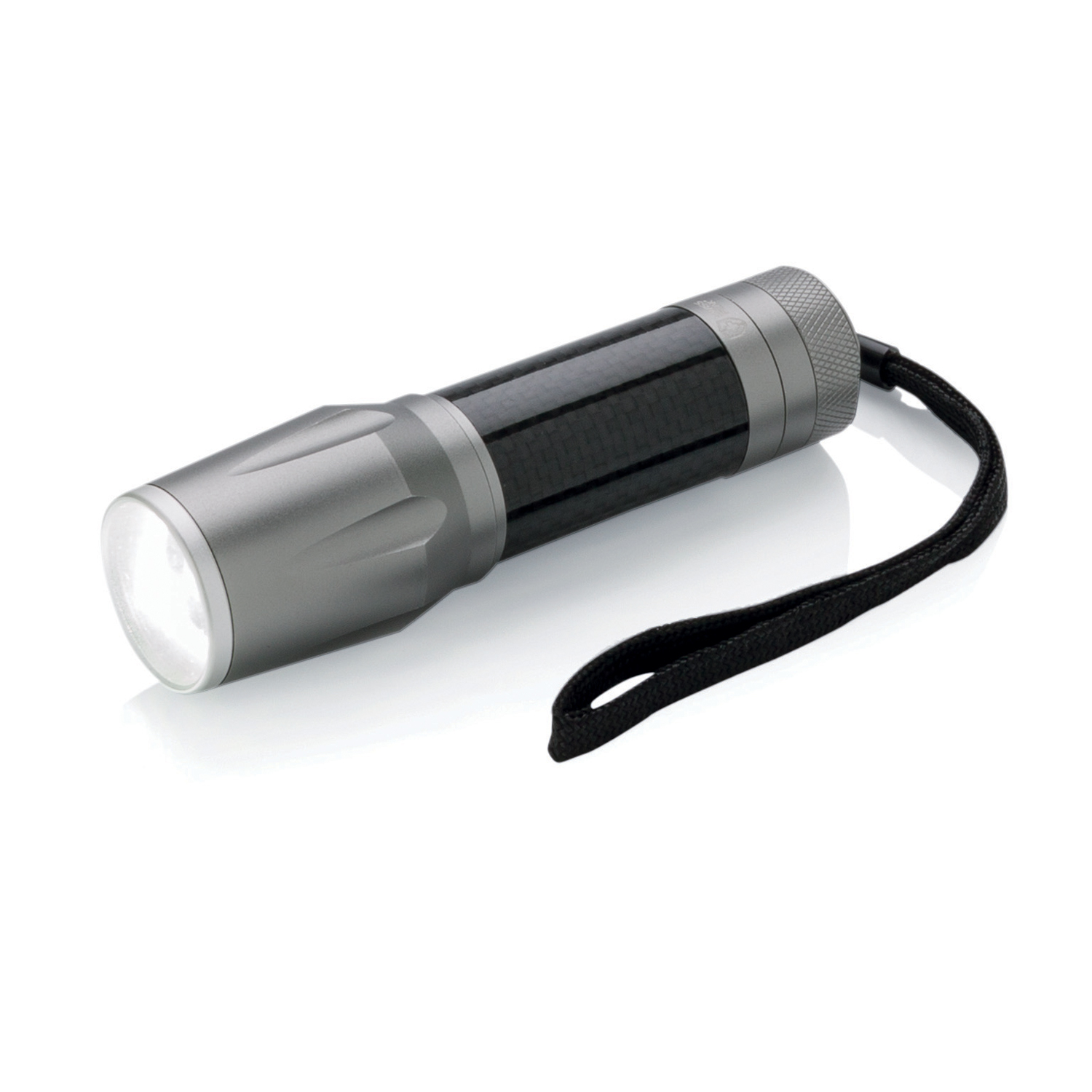 Алюминиевый фонарь-открывашка Swiss Peak с рукояткой из карбона. Сверхяркая светодиодная лампа мощностью 3 Вт. Поворотный механизм регулировки толщины пучка света. Открывашка для бутылок и ремешок на запястье. Батарейки в комплекте.