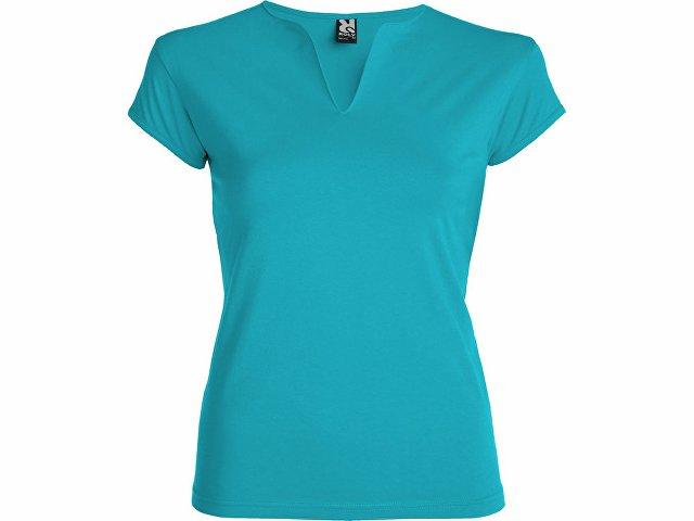 Приталенная женская футболка с круглым вырезом и v-образным разрезом спереди. Двойная отстрочка по рукавам и низу изделия.