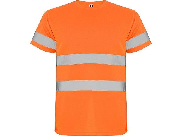 Футболка со светоотражающими элементами с короткими рукавами. Круглая горловина из той же ткани, с усиленными закрытыми швами на внутренней стороне горловины. Две горизонтальные светоотражающие полосы на туловище и одна светоотражающая полоса на рукавах.