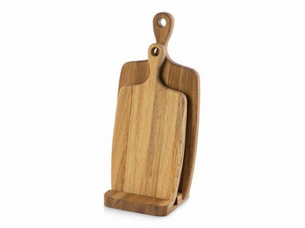 Набор от Eat&Bite состоит из двух разделочных досок из натурального дуба, а также подставки для них. Доски обработаны пищевым маслом, которое не дает древесине растрескаться и помогает поддерживать свежий вид.