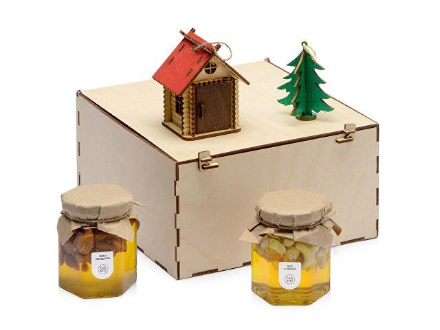 Оригинальный подарочный набор, в который входят: мед с кешью и мед с миндалем, а также новогодние украшения для вашей елки. Украшения выполнены вручную из березовой фанеры и будут замечательным подарком для любителей handmade игрушек.