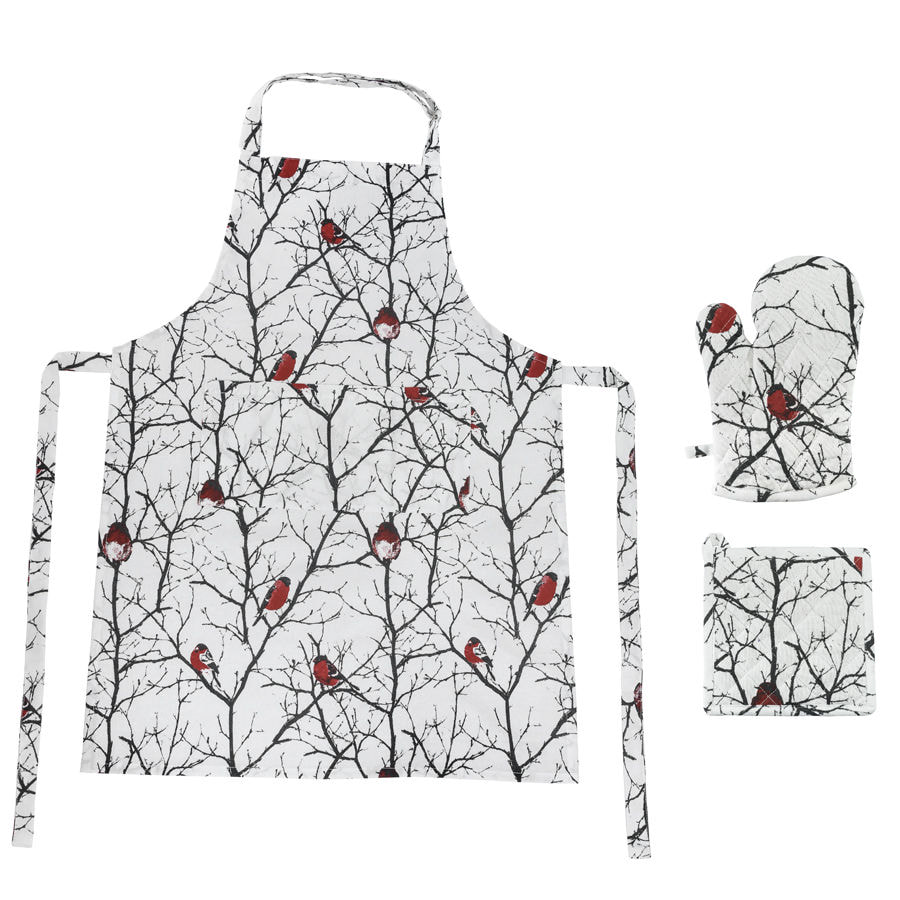 Снегирь – типичный символ русской зимы. Зима надежно замешана даже в название этих птиц – снегири, снежные птахи. Ярко-красные шарики с толстыми клювами и черными шапочками, усыпавшие ветки и так контрастирующие с ослепительно-снежным зимним лесом, – такой образ снегиря, без сомнения, знаком каждому с детства. Он кочует с одной книжной страницы на другую, перелетает с открытки на открытку, а теперь он и на всех предметах подарочного набора: на переднике и двух прихватках. Передник защитит вашу одежду во время активного приготовления новогодних блюд, а прихватки надежно сберегут ваши руки от ожогов. Состав набора: 1) Передник 2)Прихватка-рукавица 3)Прихватка прямоугольная