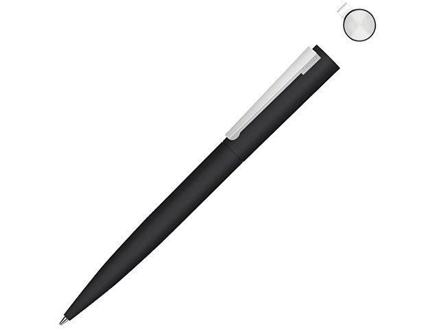 Металлическая шариковая ручка с поворотным механизмом в матовом прорезиненным корпусе soft touch, металлическим клипом на пружине и хромированной матовой вставкой на клипе.