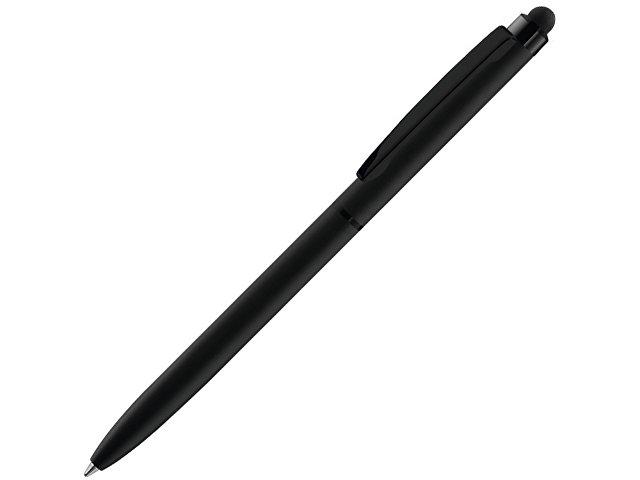 Металлическая шариковая ручка с поворотным механизмом и матовой черной поверхностью. Вставки глянцевые черные, прорезиненный наконечник корпуса для работы с сенсорными экранами.