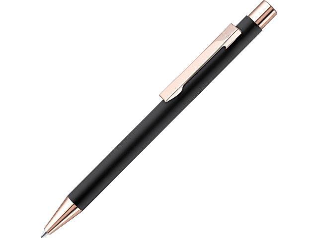 Металлическая шариковая ручка с мягким на ощупь корпусом в черном цвете, металлическим клипом, металлическим наконечником, кнопкой с глянцевой розово-золотой отделкой.