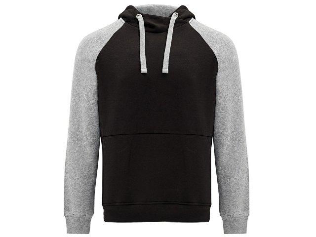 Худи с контрастным рукавом реглан. Капюшон с запахом, с контрастной подкладкой и шнурком. На полочке карман кенгуру. Манжеты рукавов и низ изделия из риба 1х1.