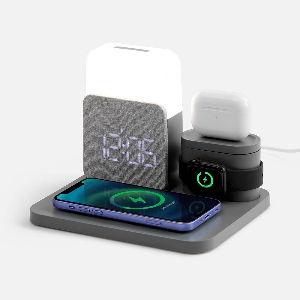 Large Charge — многофункциональное устройство, которое сочетает в себе функции станции для проводной и беспроводной зарядки разнообразных устройств, настольных часов с будильником и лампы.